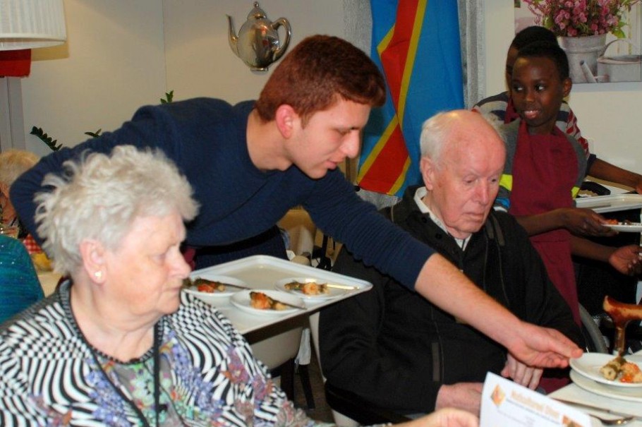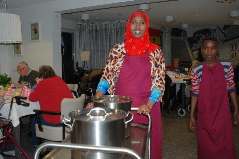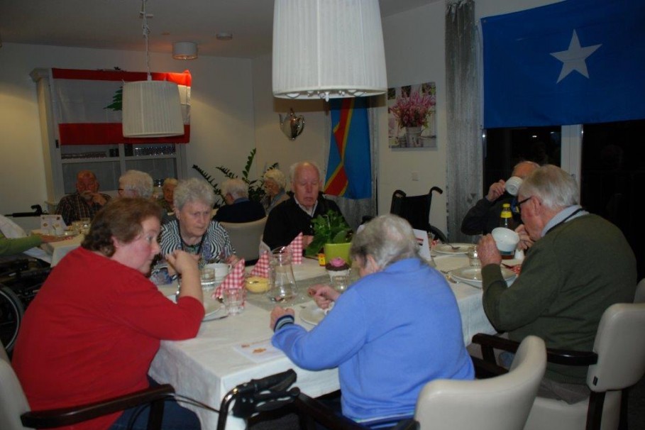Woensdag 14 januari werden de bewoners van de afdeling Somatiek van Zorgcentrum Nicasius verrast met een multi cultureel diner. Dit op initiatief van Britt Hilligers, 3e jaars studente Maatschappelijk werk. Als stage opdracht wilde zij samen met vluchteling ouders en kinderen uit de regio Heeze koken voor ouderen. Zorgcentrum Nicasius bood hen hiertoe graag de gelegenheid. M.m.v. Marianne van Gorp en Marlies Moonen was een gevarieerd 4 gangen menu bereid. Dit werd door de kinderen zeer vriendelijk en keurig uitgeserveerd. Hoewel aanvankelijk wat voorzichtig bij de voor hen vreemde gerechten, hebben de bewoners volop genoten van dit lekkere diner. Het was voor alle betrokkenen een groot succes.