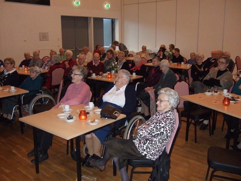 Als eerste bezocht hij met zijn zwarte pieten de bewoners van de afdeling PG. Hij verraste de bewoners met enige spellen waar zij allemaal gebruik van kunnen maken. Ondertussen zaten de overige bewoners, samen met de mensen van de aanleunwoningen, al te wachten in de grote zaal van “t Perron”. Hier werden zij volop vermaakt door de Kanariepiet die allemaal liedjes ten gehore bracht. Er kon en er werd volop meegezongen. Ook kletste hij het geheel aan elkaar.