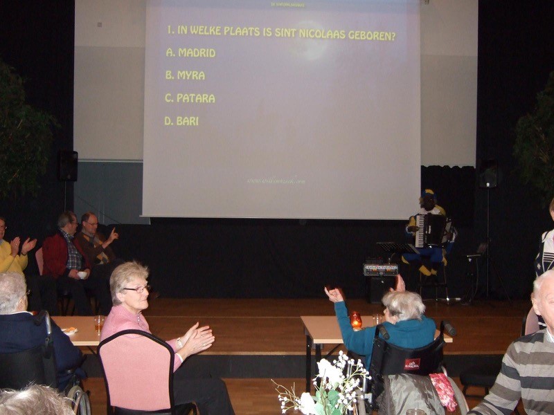 Bij binnenkomst van Sint Nicolaas met zijn gevolg steeg de spanning ten top. Maar eerst moest het bestuur van de Vrienden Zorgcentrum Nicasius deelnemen aan een quiz. Allemaal vragen over de goed heilig man. De voorzitter Peter van Lieshout was de winnaar.