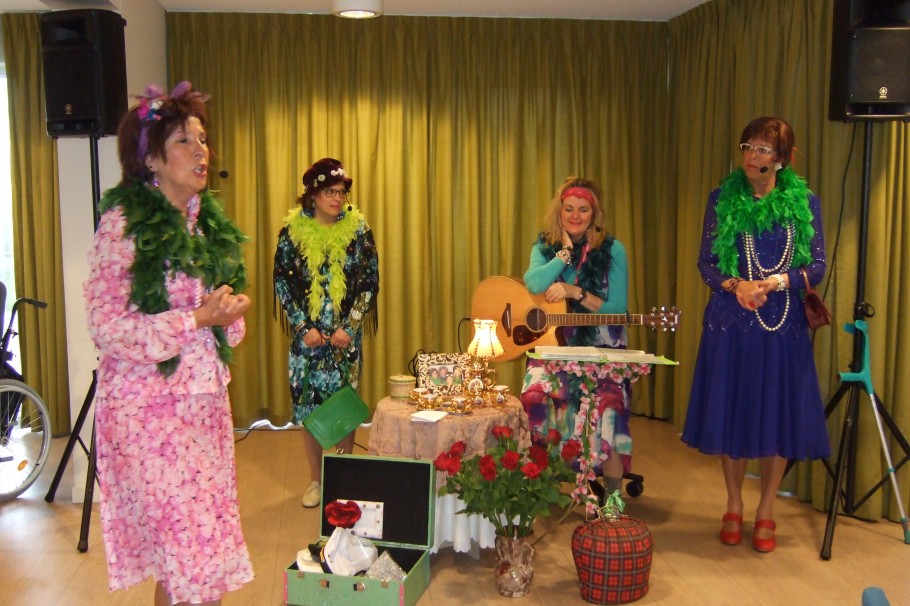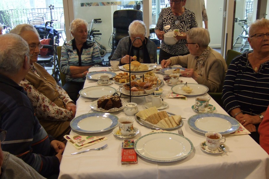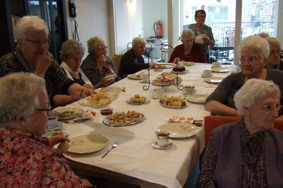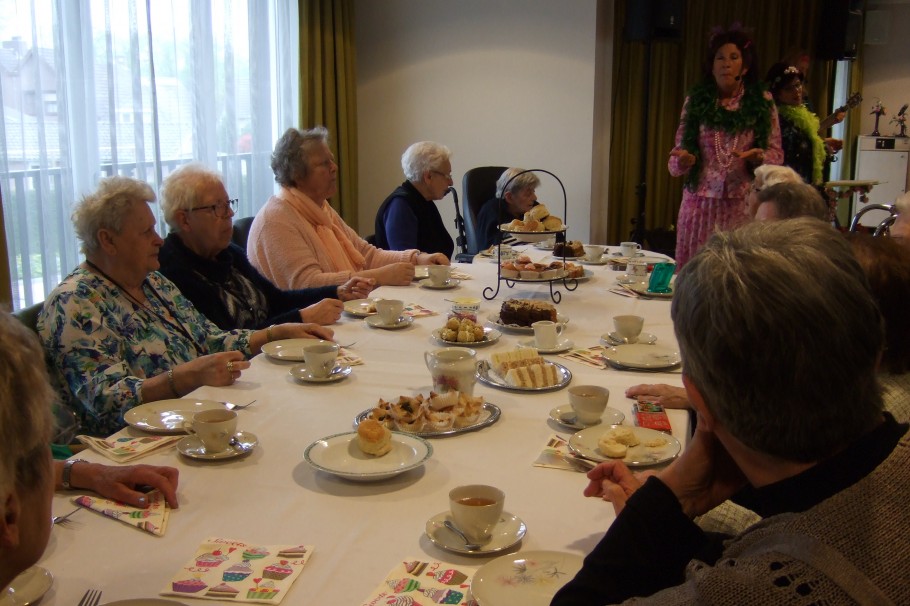 vrijdag 21-04-2017, was er een High Tea met een optreden van de Theetantes gepland. De Picassozaal was omgetoverd tot een Engelse High Tea zaal. De tafels waren mooi gedekt en voorzien van allemaal heerlijke lekkernijen. De vrijwilligsters zorgde dat niemand iets te kort kwam. De Theetantes (4 dames) verzorgde de muzikale omlijsting. Ze namen ons mee terug in de tijd. Van de eerste keer verlieft worden, dansen met de kermis en zo het hele levensweg. Bij ieder hoofdstukje van het leven hadden ze een passend liedje. Het een en ander was een groot succes. Na afloop bleef iedereen zitten om gezellig na te praten. Het een en ander is mogelijk gemaakt door het Swaans Betonfonds en de Vrienden van Zorgcentrum Nicasius.