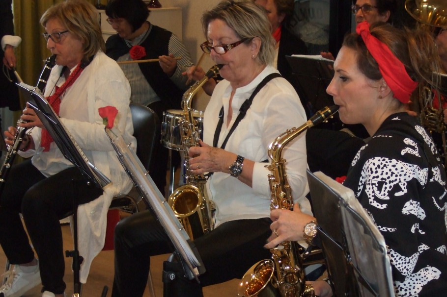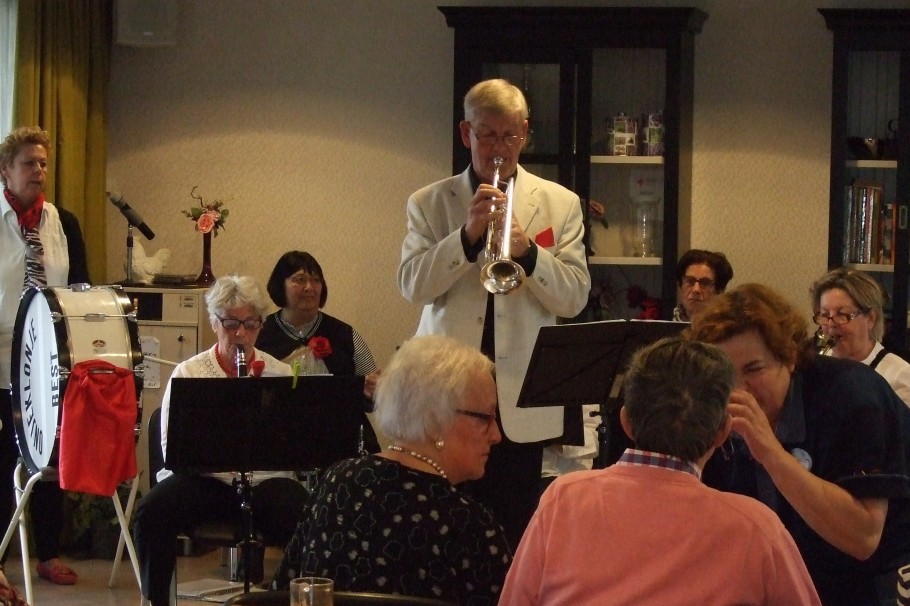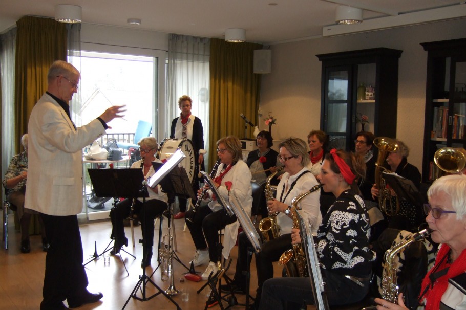 De Picassozaal in woonzorgcentrum Nicasius was tot de laatste plaats gevuld. Het blaasorkest “Onjeklonje” uit Best kwam een concert geven. Onjeklonje is een blaasorkest met uitsluitend dames maar met een man als dirigent. Vol enthousiasme speelde zij er op los. Veel bekende liedjes presenteerde zij. De bewoners van het woonzorgcentrum en de mensen van de aanleunwoningen genoten met volle teugen. Zoals gebruikelijk waren er ook volop koffie, thee, hapje en drankjes. Het een en ander is mogelijk gemaakt door de Vrienden Zorgcentrum Nicasius. We kunnen terugzien op een fijne middag.