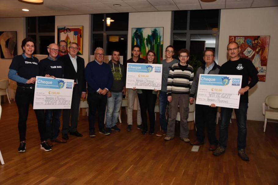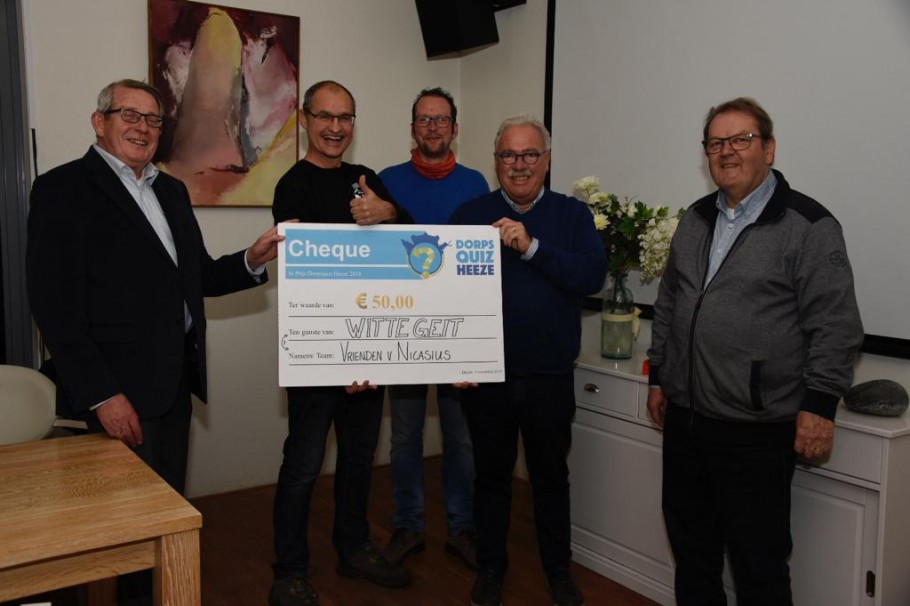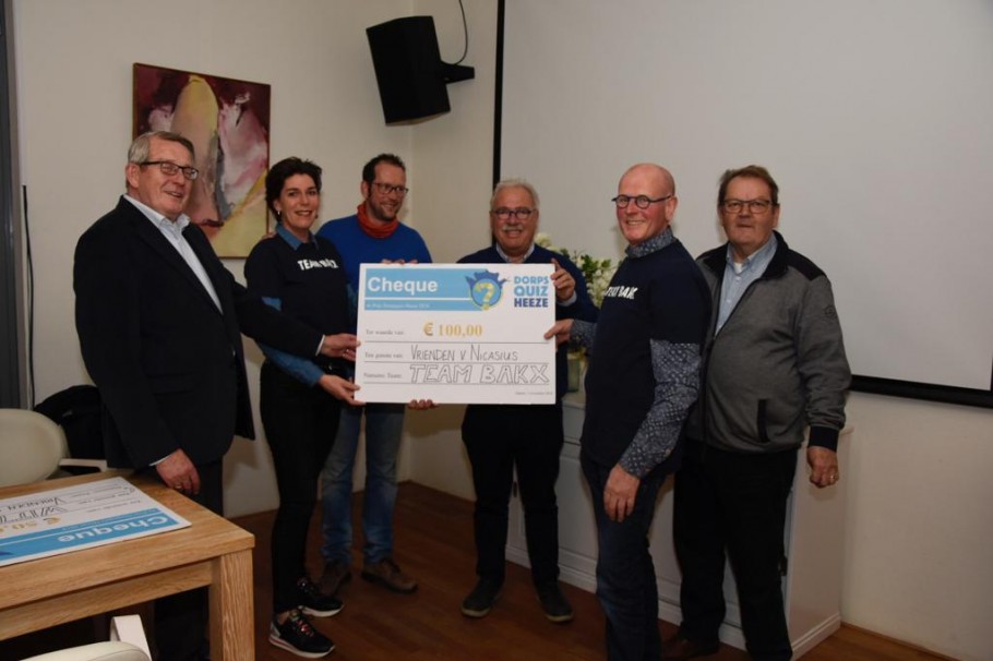 Van deze top vijf van de tweede Dorpsquiz Heeze hadden er maar liefst drie de Vrienden Zorgcentrum Nicasius in Heeze als goede doel gekozen. Maandagavond werd door de winnaar, de vierde en de vijfde prijs een cheque overhandigd aan de Vrienden Zorgcentrum Nicasius. Dit gebeurde in Dorpshuis 't Perron in Heeze. De Bingoclub 2.0 won de Dorpsquiz Heeze dit jaar en overhandigde € 500,-. De vierde prijs was voor Team Bakx. Zij mochten € 100,- overhandigen en de vijfde plaats van Witte Geit was goed voor € 50,-. Een totaalbedrag van € 650,- voor de Vrienden Zorgcentrum Nicasius die met het geld weer iets extra's kunnen doen voor de bewoners.