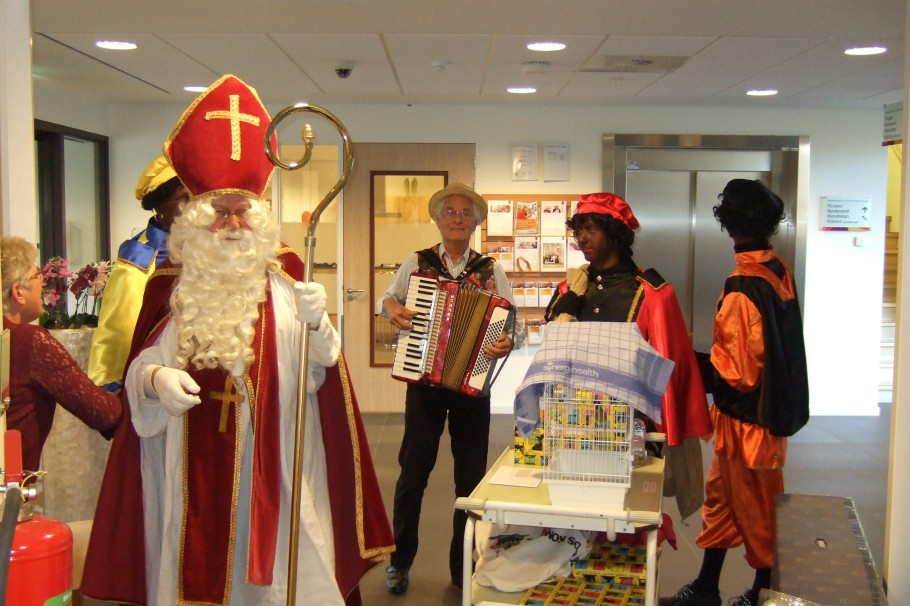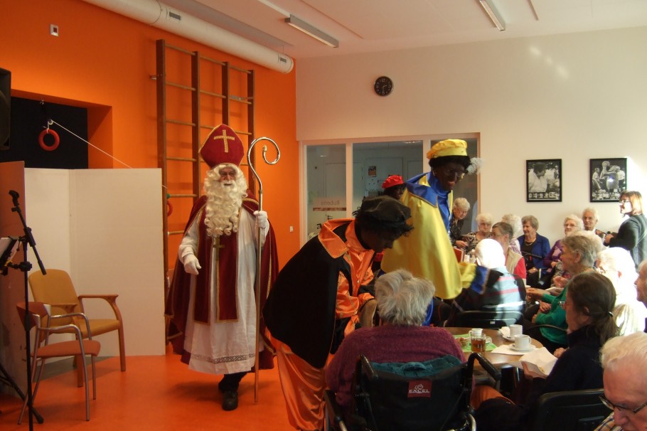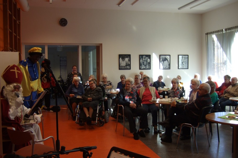 Om 16.00 uur was de Rubenszaal helemaal gevuld met de bewoners van de afdeling Somatiek en de aanleunwoningen van Woonzorgcentrum Nicasius. Iedereen was in afwachting van de komst van Sint Nicolaas en zijn zwarte pieten. Het duo Rob en Kelly verzorgde de muzikale omlijsting van deze middag. Zij brachten een scala aan meezingers en natuurlijk ook Sinterklaas liedjes. Na eerst de medewerkers en de vrijwilligers te hebben bedanken voor hun inzet, had hij persoonlijke cadeaus voor alle bewoners. Er was ook volop snoepgoed, hapjes en drankjes voor iedereen. De goed heiligman maakte daarna zijn opwachting in de huiskamers van de PG afdeling. Hij had voor iedereen een goed woord en een cadeau per huiskamer. Een Interactieve Kat, vogelkooi met vogel en andere cadeaus. Iedereen in het Woonzorgcentrum Nicasius kan terug zien op een leuke en gezellige middag. Deze middag werd mogelijk gemaakt met steun van Vrienden Zorgcentrum Nicasius.